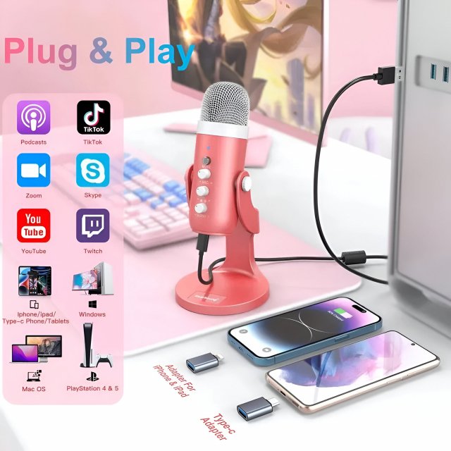 Make your voice heard with confidence and clarity using this elegant pink USB studio microphone. Designed for creators, gamers, podcasters, and professionals alike, this condenser microphone delivers crisp, high-quality sound that enhances every word you say. Its vibrant color and sleek metal design add a touch of personality to any setup—because great sound deserves great style.